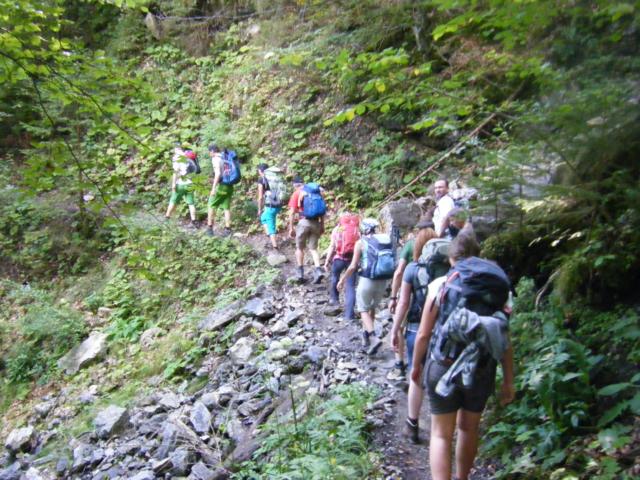 Das Wetter ist gut, die Sonne lacht und hochmotiviert nehmen wir den Berg in Angriff. Über die Reichenbach-Klamm führt uns unser Weg stetig bergan Richtung Bad Kissinger Hütte. Über Stock und Stein geht es vorbei an Wasserfällen, entlang an Felsen und Wiesen.