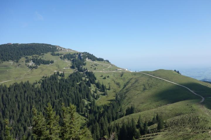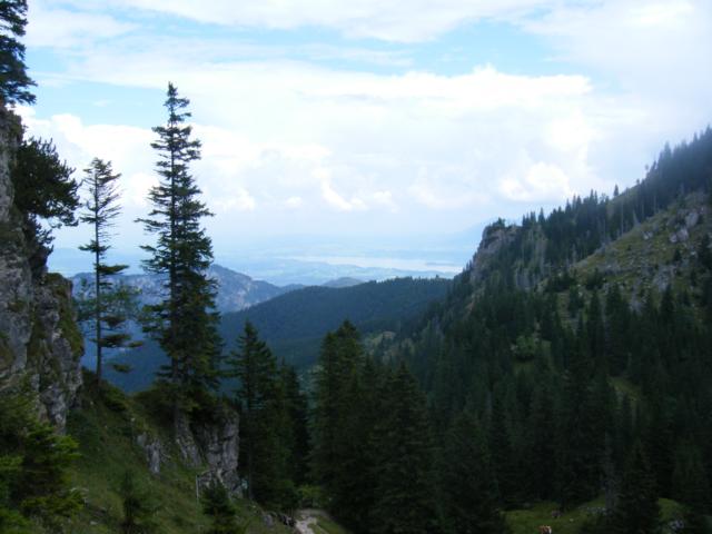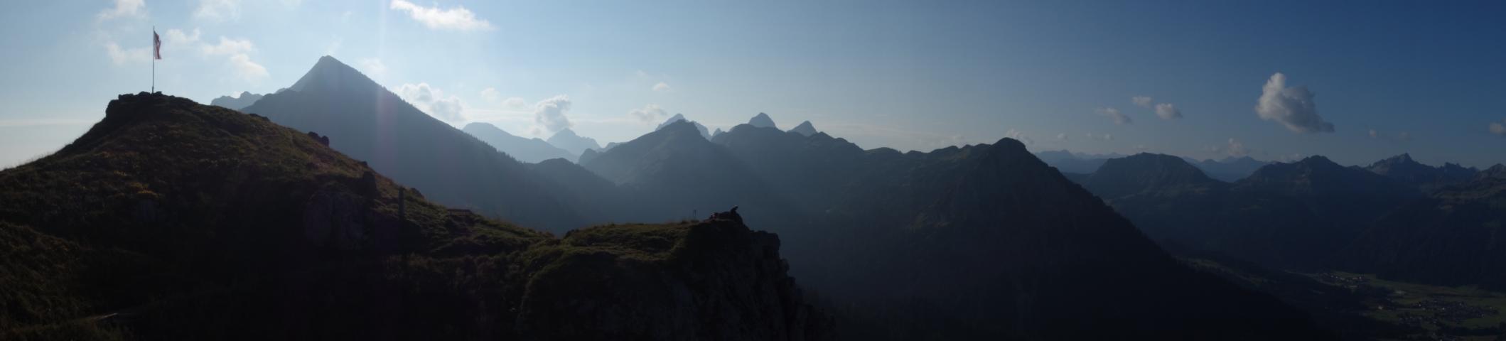 Nach dem ein oder anderen Schweißtropfen (oder eher Schweißbächen), stehen wir am Kamm des Berges, irgendwie direkt auf der Grenze zwischen Deutschland und Österreich. Auf der einen Seite der Blick nach Deutschland: wir sehen bis nach Füssen, und in der Ferne sogar Schloss Neuschwanstein. Auf der anderen Seite Österreich: Berggipfel soweit das Auge reicht. Wunderschön.