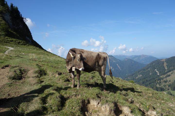 Je höher wir kommen, desto beeindruckender wird das Bergpanorama. Wir sehen die ersten waschechten Allgäu-Kühe, hören überall ihre Glocken läuten. Und obwohl wir ja zu Hause wirklich selber genügend Kühe haben, ist es hier etwas anderes. Etwas Besonderes. Die Kühe bewegen sich frei. Und genau so fühlen wir uns auch. Frei und weit weg von allen Verpflichtungen. Über uns – stetig im Blick – unser Ziel, der Gipfel des Aggensteins. Kaum zu glauben, dass wir da wirklich irgendwann ankommen sollen.