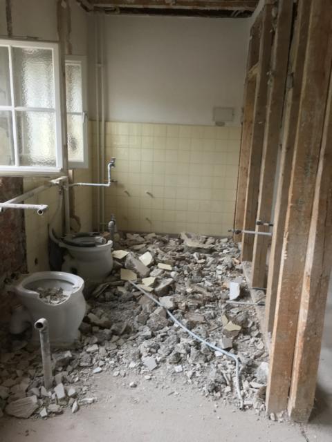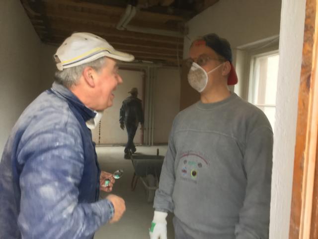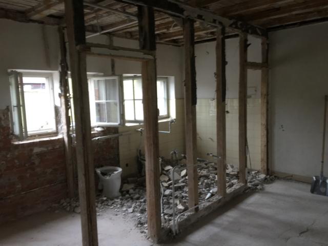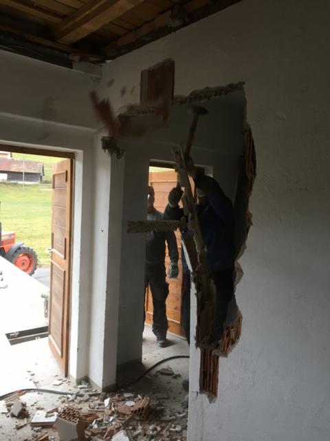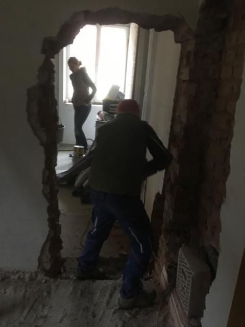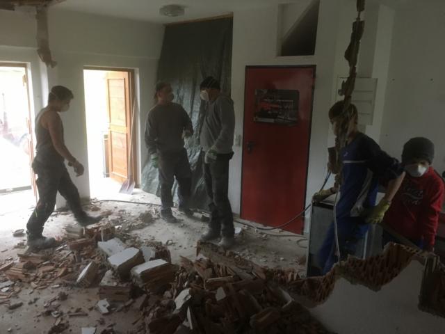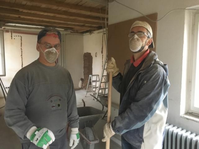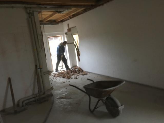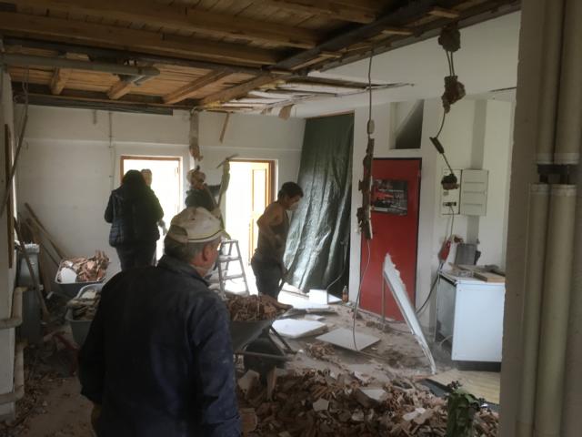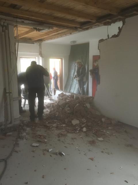 Auch am heutigen Samstag, den 26.11.2016 fanden sich wieder nette Helfer im ehem. Rathaus ein, um unter extremen Bedingungen den Innereien des ehemailgen Rathauses an den Kragen zu gehen. Mit Mundschutz und voller Elan wurden die letzten Decken herunter geholt und der Boden des alten Archivs heraus gespitzt. Ebenfalls wurde die Trennwand im bisherigen Feuerwehrraum entfernt.