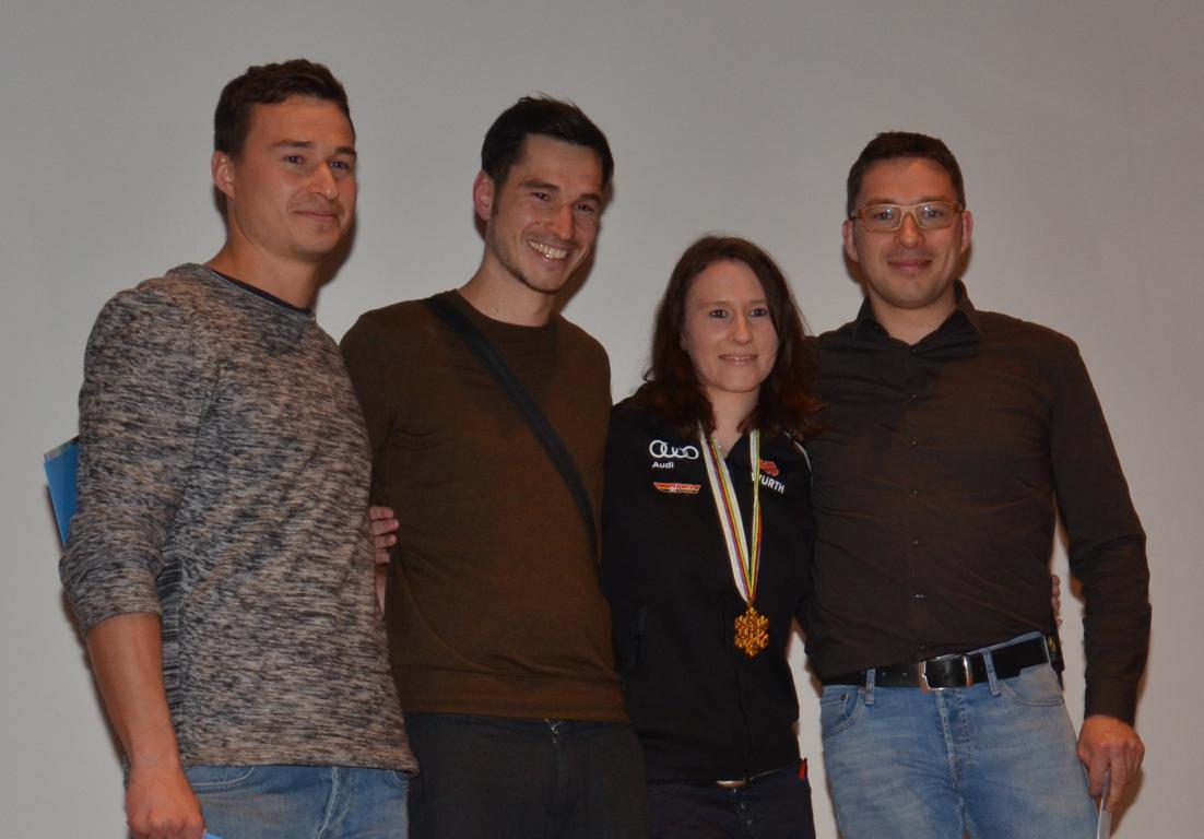 Bürgermeister Armin Hinterseh, unser Vorstand Andi Heizmann, SVS Vizepräsident Martin Schlegel, Bezirksobmann und ARGE-Sport-Sprecher Gustl Frey sowie Ramona´s Jugendtrainer Ernst Wursthorn zeigten in ihren Worten sichtlich ihren Stolz und die Anerkennung von Ramonas Leistung. Mit beindruckenden Bildern und Filmausschnittetn wurde nochmals eindrücklich sichtbar, was Ramona und den DSV-Mädels bei der WM in Seefeld gelungen ist.