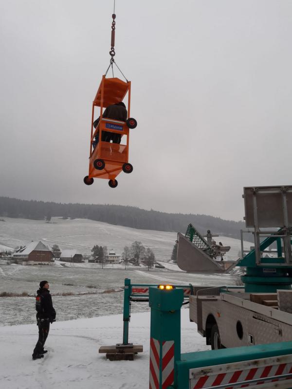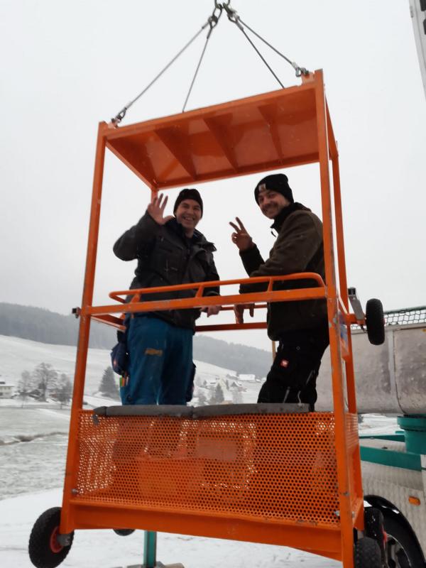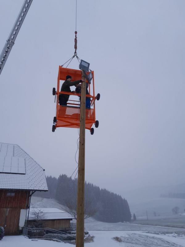 Bei frostigen Temperaturen wurde der nicht alltägliche Arbeitseinsatz, dank unsererer Profis mit ihren super Gerätschaften ein toller Erfolg. Mit dem Kran von Christian Walter konnte die Montage der Strahler in luftiger Höhe zügig und gefahrlos umgesetzt werden. Wir möchten uns ganz herzlich bei den fünf Helfern für ihre Unterstützung bedanken.