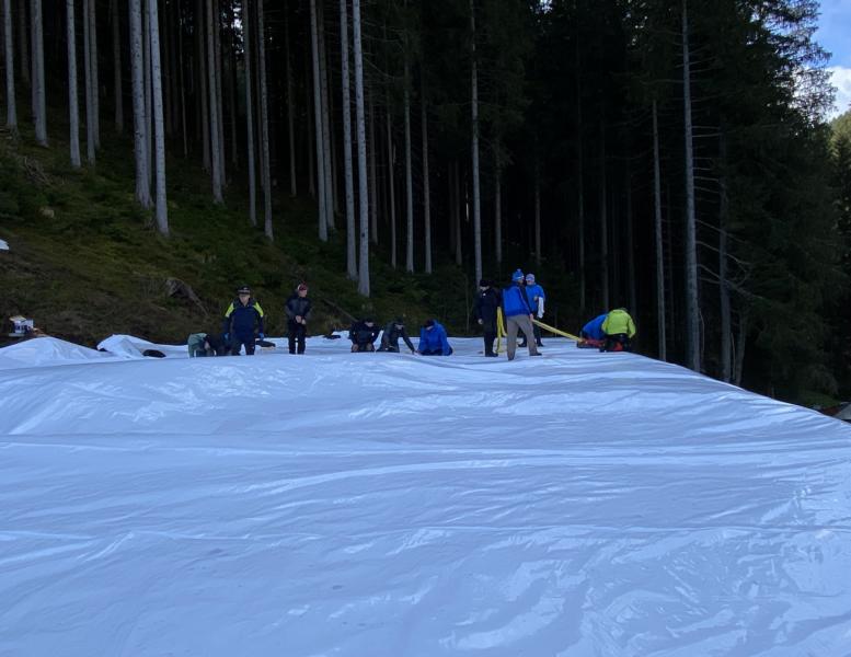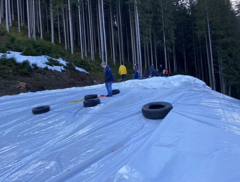 Gegen Mittag war es dann geschafft und der weiße "Gletscher" war unter einer weißen Folie verschwunden, welche das kostbare Material für den kommenden Winter hoffentlich gut schützt.