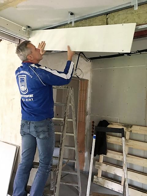 Für unsere frewilligen Helfer galt es in dieser Woche im Saal die Deckenhalterungen anzubringen und die Stahlträger fachmännisch zu verkleiden. Im Außenbereich musste zudem noch die Untersicht am Dach angebracht werden.