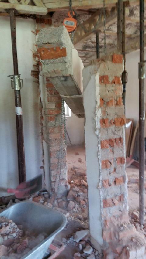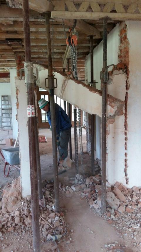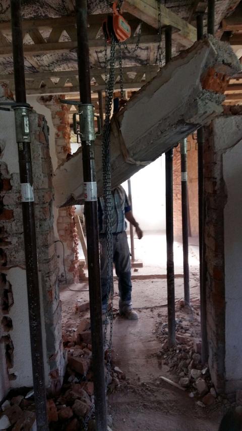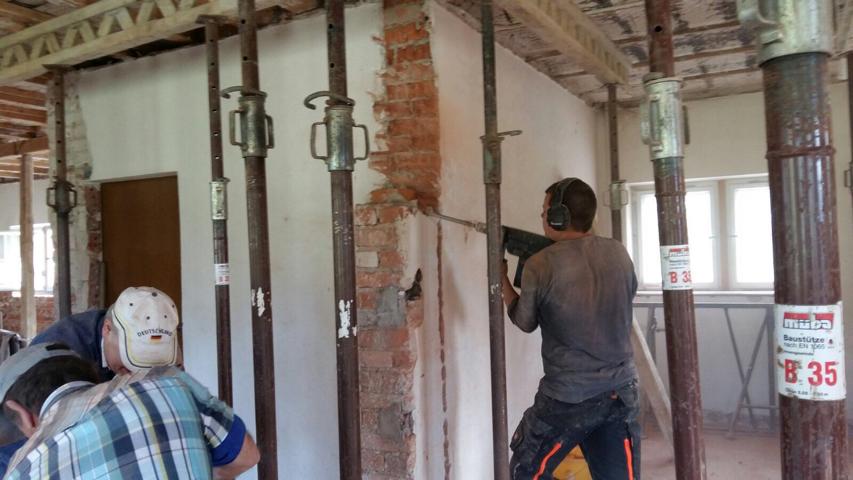 Es ist nun der Weg bereitet, dass Mitarbeiter des Baugeschäft Rombach die schweren Eisenträger einbauen können, welche die Last der oberen Stockwerke des ehem. Rathauses zukünftig tragen werden.