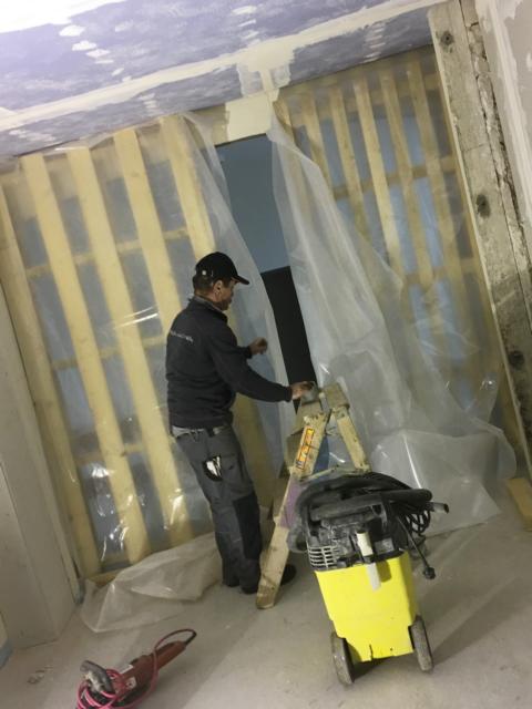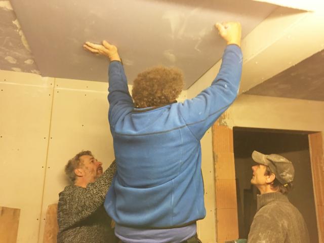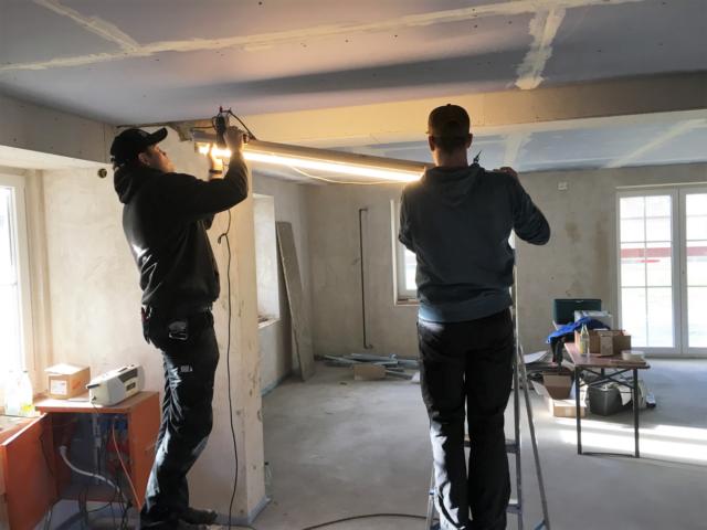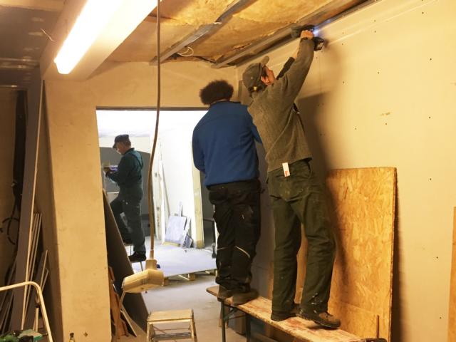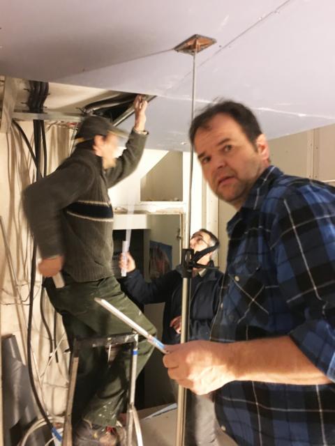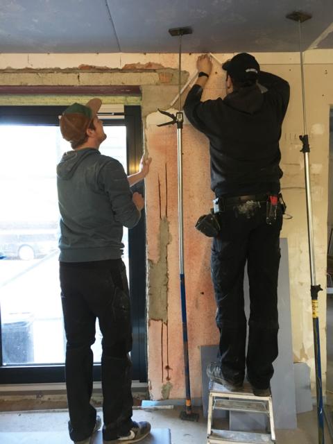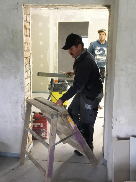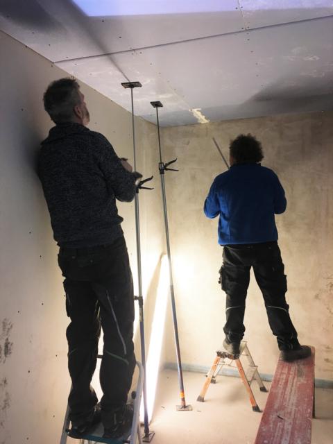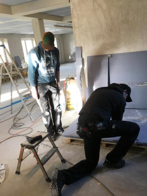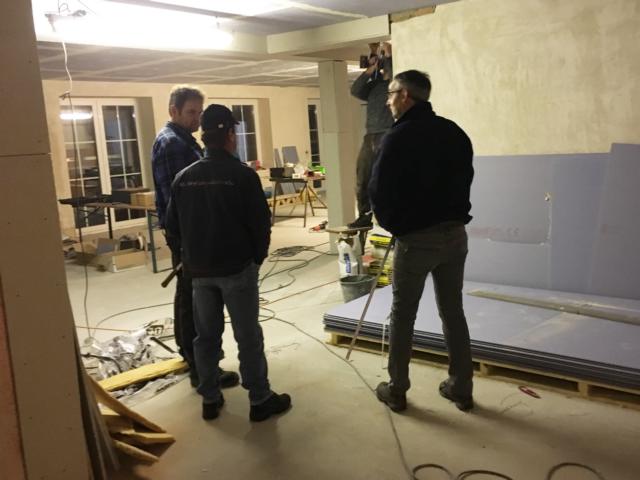 Am am gestrigen Donnerstag und am heutigen Freitag, den 03. u. 04.01.2018 stand der erste Arbeitseinsatz auf unserer Bürgerhaus-Baustelle an. Aufgrund des heftigen Wintersturms Burglinde und dem damit verbundenen Hochwasser waren unsere Feuerwehmitglieder teilweise bei Helfereinsätzen gefordert und konnten nur bedingt auf der Baustelle sein. Trotzdem hatten wir an beiden Tagen eine schlagkräftige Truppe am Start und konnten richtig große Fortschritte machen. Ein Vorteil war, dass wir aufgrund der Absage des Bezirksstaffellauf etwas freier in dieser Woche waren. Bis auf Kleinigkeiten sind beide Lagen der Gipsplatten für die Schallschluckdecke montiert und verspachtelt. Ebenso mussten wir heute nochmals Lärm und Staub erzeugen um die Höhe einer zukünftigen Türe anzupassen.