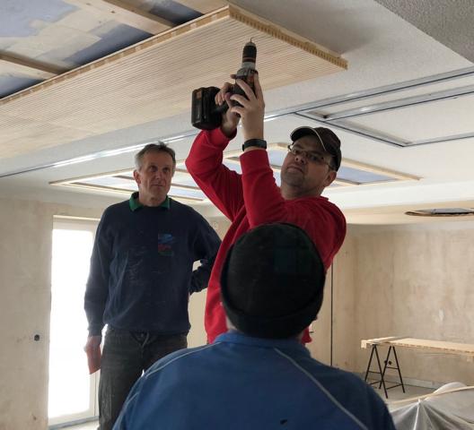 Am am heutigen Samstag, den 3.3.2018 und den vergangenen Wochen wurde unter der Federführung von Markus Faller die neue Akkustikdecke in unserem zukünftigen Bürgerhaus montiert. Mit viel Geschick und Können waren wieder zahlreiche ehrenamtliche Helfer auf der Baustelle. Nachdem wir im vergangenen Wochenende mit dem Kinderskifest den Rohbau schon eingeweihen konnten, ist die Motivation, unser Gemeinschaftswerk zum Ende zu bringen noch mehr gestiegen.