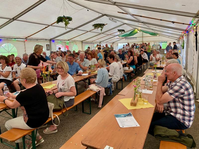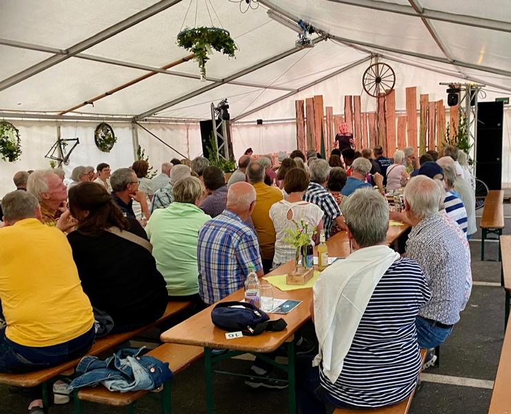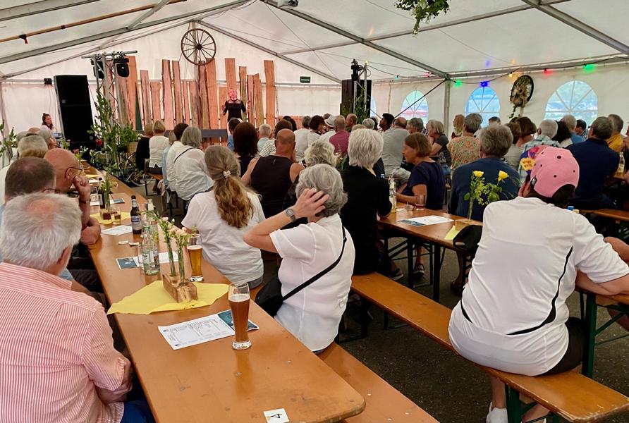 Am Samstagabend haben sich trotz schlechter Wetterprognose knapp 100 Menschen im Zelt eingefunden, um die Kabarettistin Marianne Schätzle vom Bodensee zu begrüßen. Mit ihrem Programm „ES ISCH WIE´S ISCH“ hat sie das Zelt gut unterhalten und für etliche Lacher gesorgt. Das Publikum hatte sie schnell in ihren Bann gezogen. Gekonnt griff sie alltägliche Situationen auf, präsentierte sie à la Marianne Schätzle, so dass sich wohl jeder im Zelt an irgendeiner Stelle wiedergefunden hat und man dann vielleicht nicht nur über ihre Witze lachen konnte, sondern an der ein oder anderen Stelle auch über sich selbst.