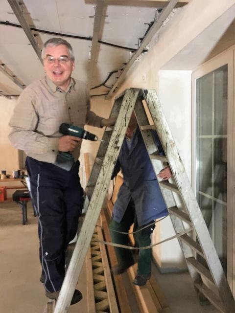 Waren doch in den vergangenen Wochen die anwesenden Helfer etwas dünner gesät, können wir uns in dieser Woche über viele nette und fleißige Helfer freuen. Unser Bauleiter Hansjörg durfte am Donnerstagabend 11 Helfer koordinieren und war sichtlich begeistert. Bis zur einzuhaltenden Ruhezeit um 22:00 Uhr machten wir sichtbare Fortschritt an der zukünftigen Decke. Am Freitag begannen Bigit und Hermann dann noch mit dem Streichen der Dachunterseite. Einfach toll!!!