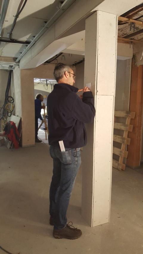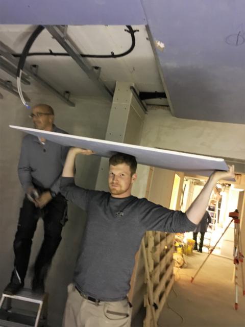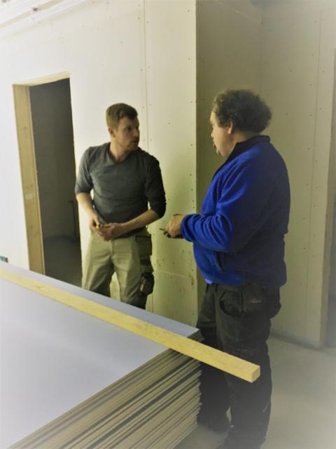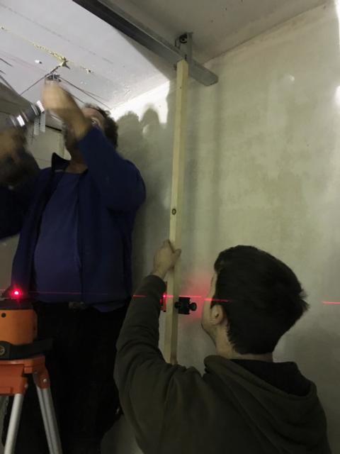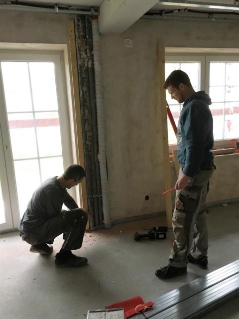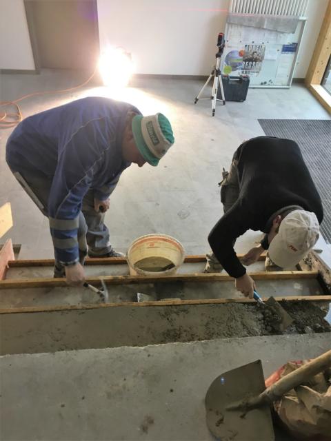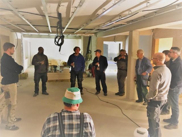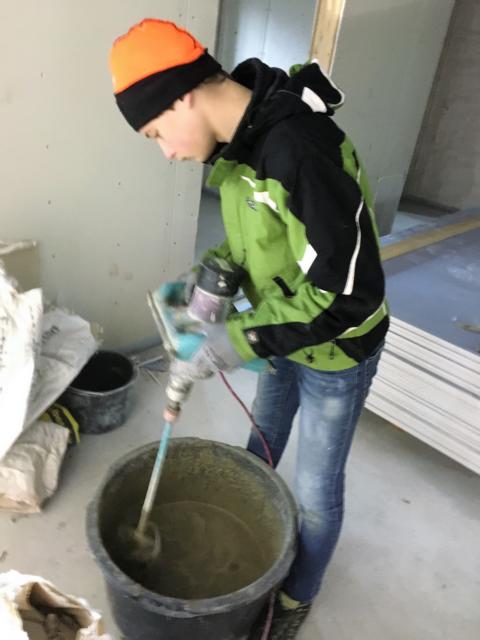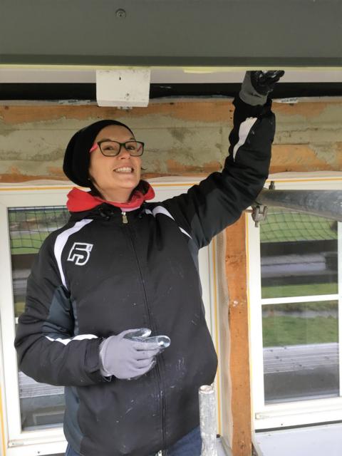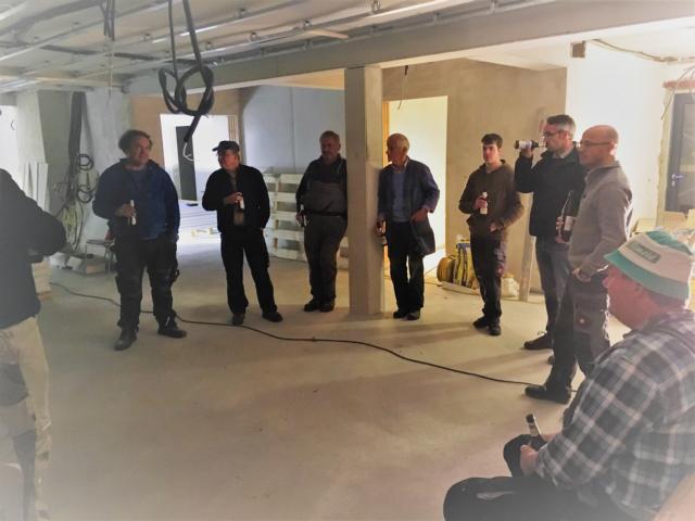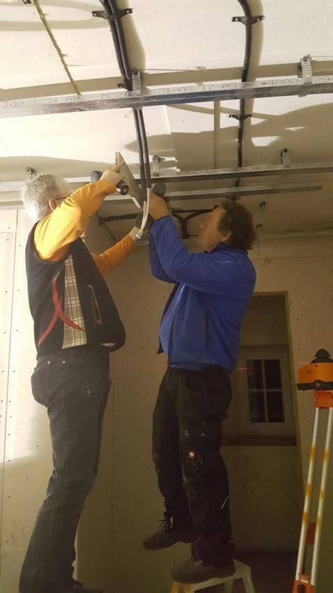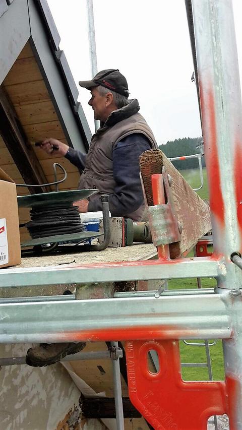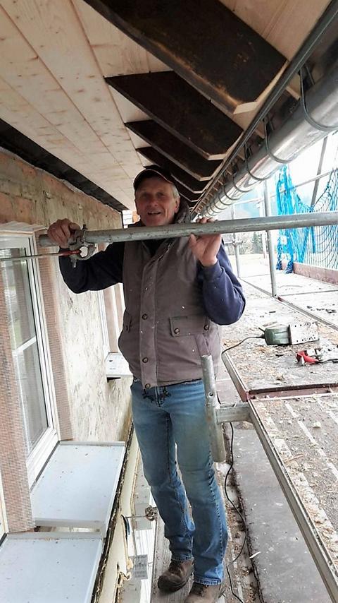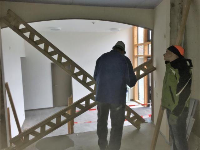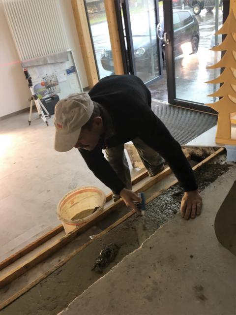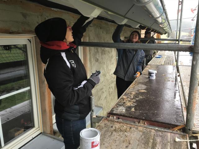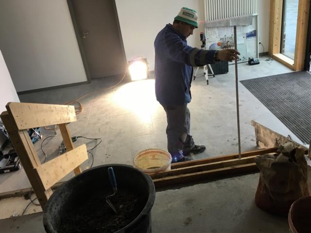 Am Samstag waren mehrere Gewerke angesagt: So verkleiden Markus und Matthias Rohtleitungen. Hansjörg, Gerhard Hermann und Andi glichen unter anderem die Zugangstreppe mit Estrich an. Anika, Sarah, Florian, Timo, Clarissa und Mario strichen weiter an der Dachunterseite, was bei dem naßkalten Wetter einiges von ihnen abverlangte.