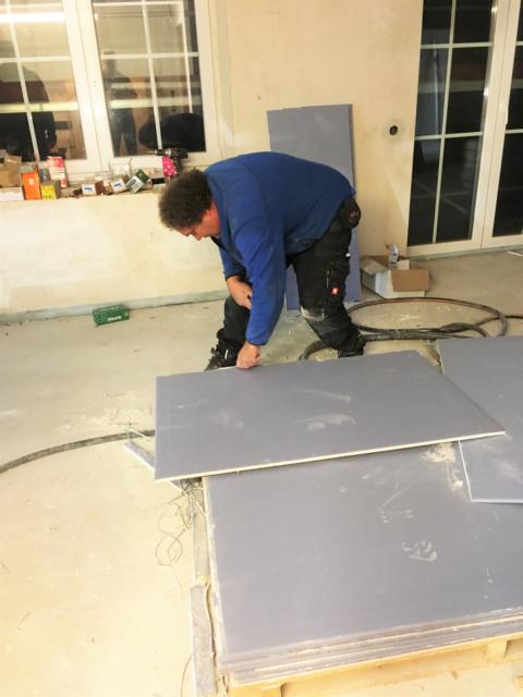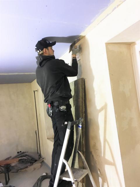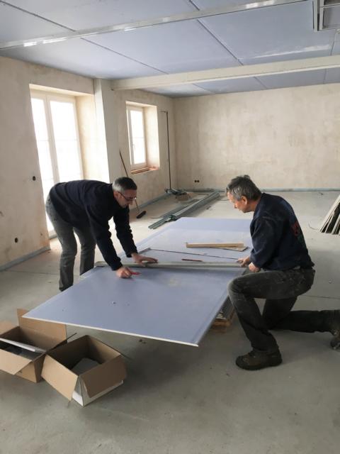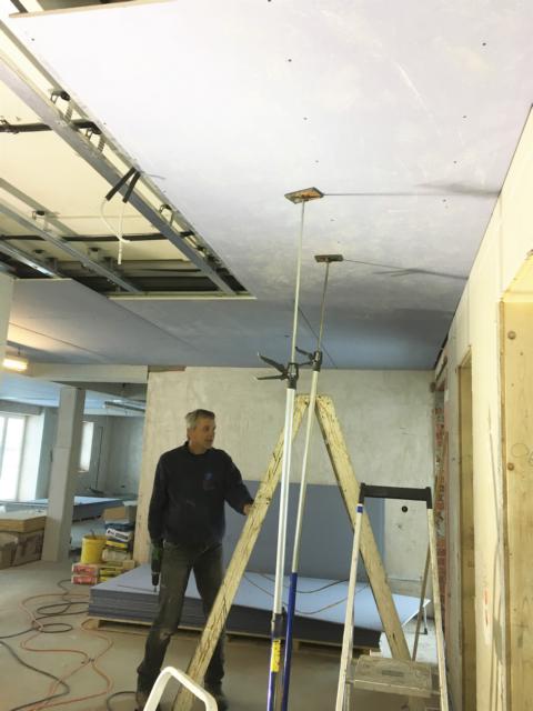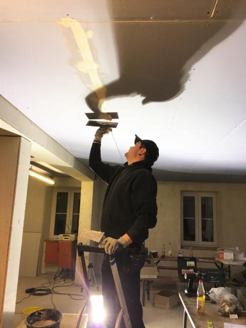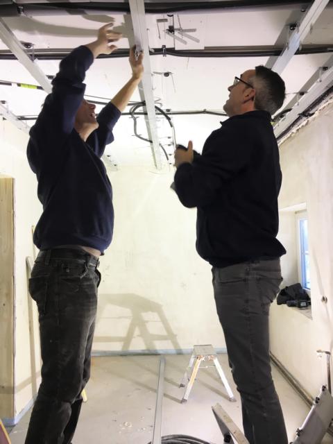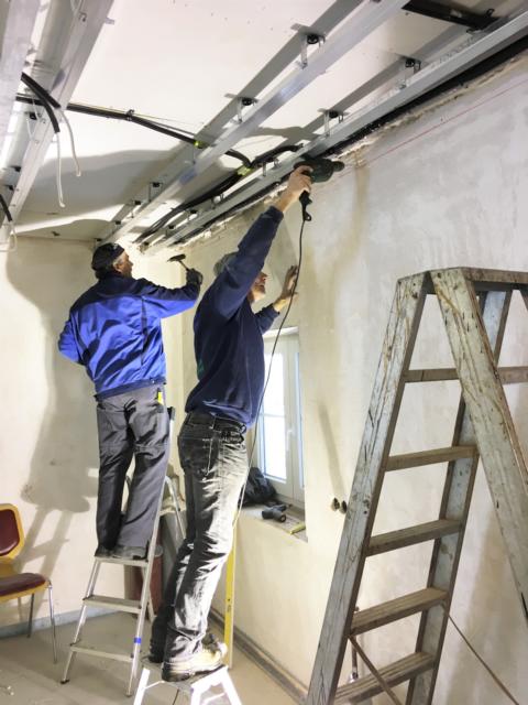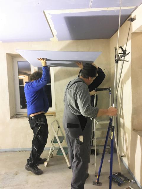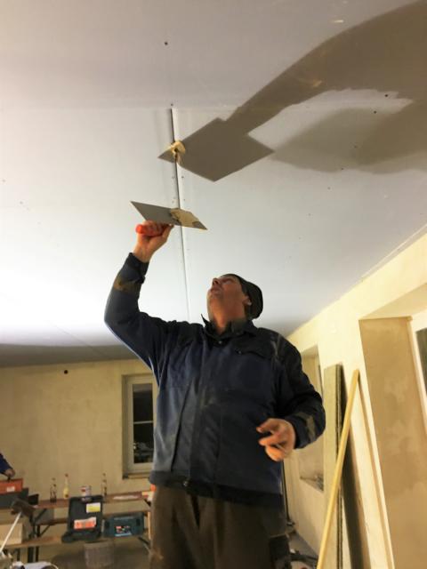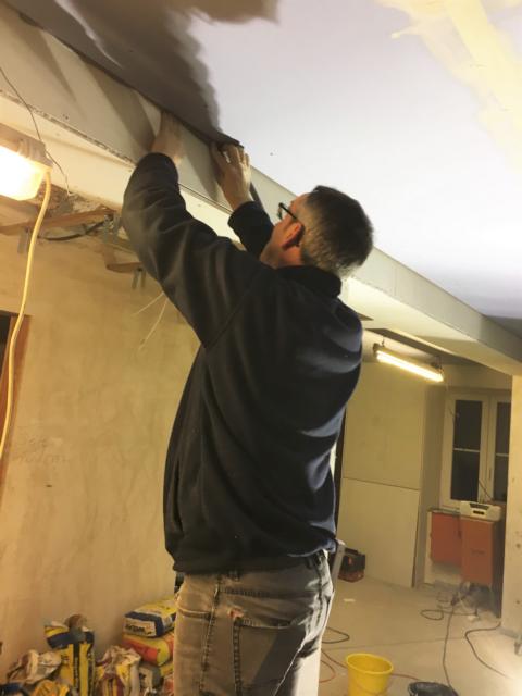 Ebenso wurde weiter an der doch recht aufwändigen Schallschluckdecke gearbeitet. Am gestrrigen Donnerstag, den 21.12.2017 konnten wir nun Teile der ersten Lage Rigipsplatten zu spachteln und mit der Zweiten beginnen.